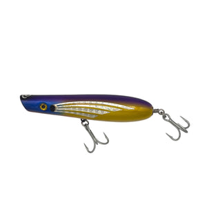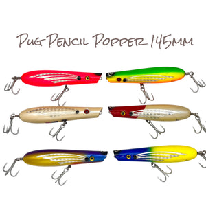 Designed for bluewater fishing, the handcrafted timber Pug Pencil Popper 145 creates surface commotion that predatory species can't ignore. Its deep cupped face generates splash and noise, triggering explosive strikes from GTs, Red Bass, Tuna, Coral Trout, and more.
