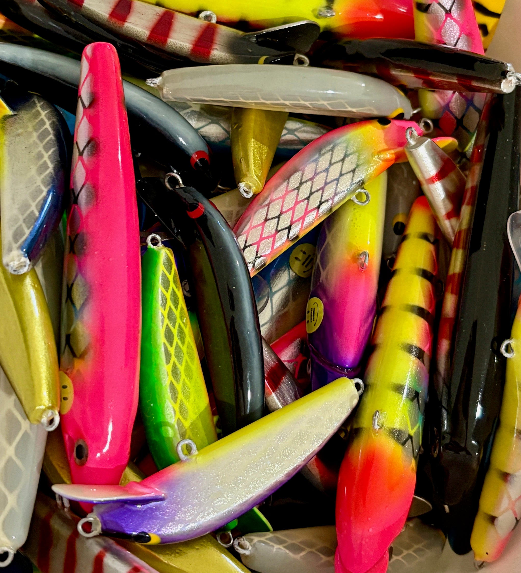 These “seconds” didn’t pass our swim test or meet our usual quality standards, so they do NOT swim and are not for use as actual fishing lures. But they’re still perfect for: